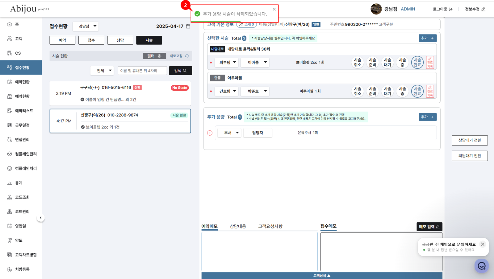 “추가 용량 시술이 삭제되었습니다.” 라는 문구가 뜨면 삭제 완료 입니다.