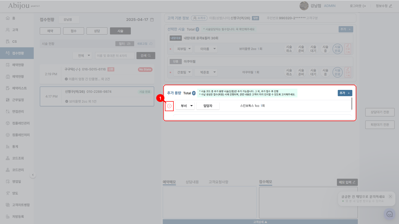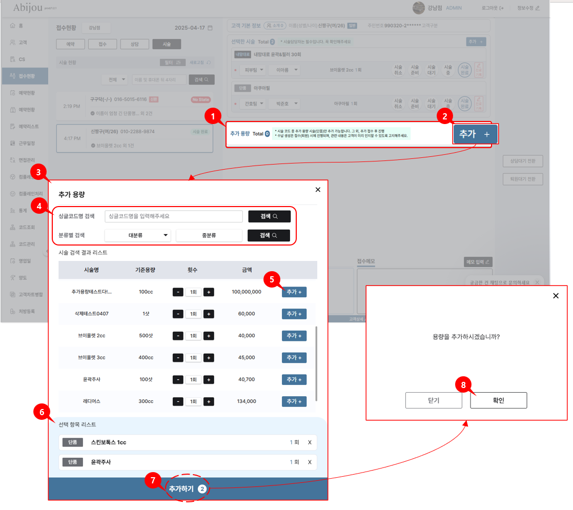 용량 혹은 추가적으로 필요한 시술이 있는 경우 [추가] 버튼 클릭해주세요.