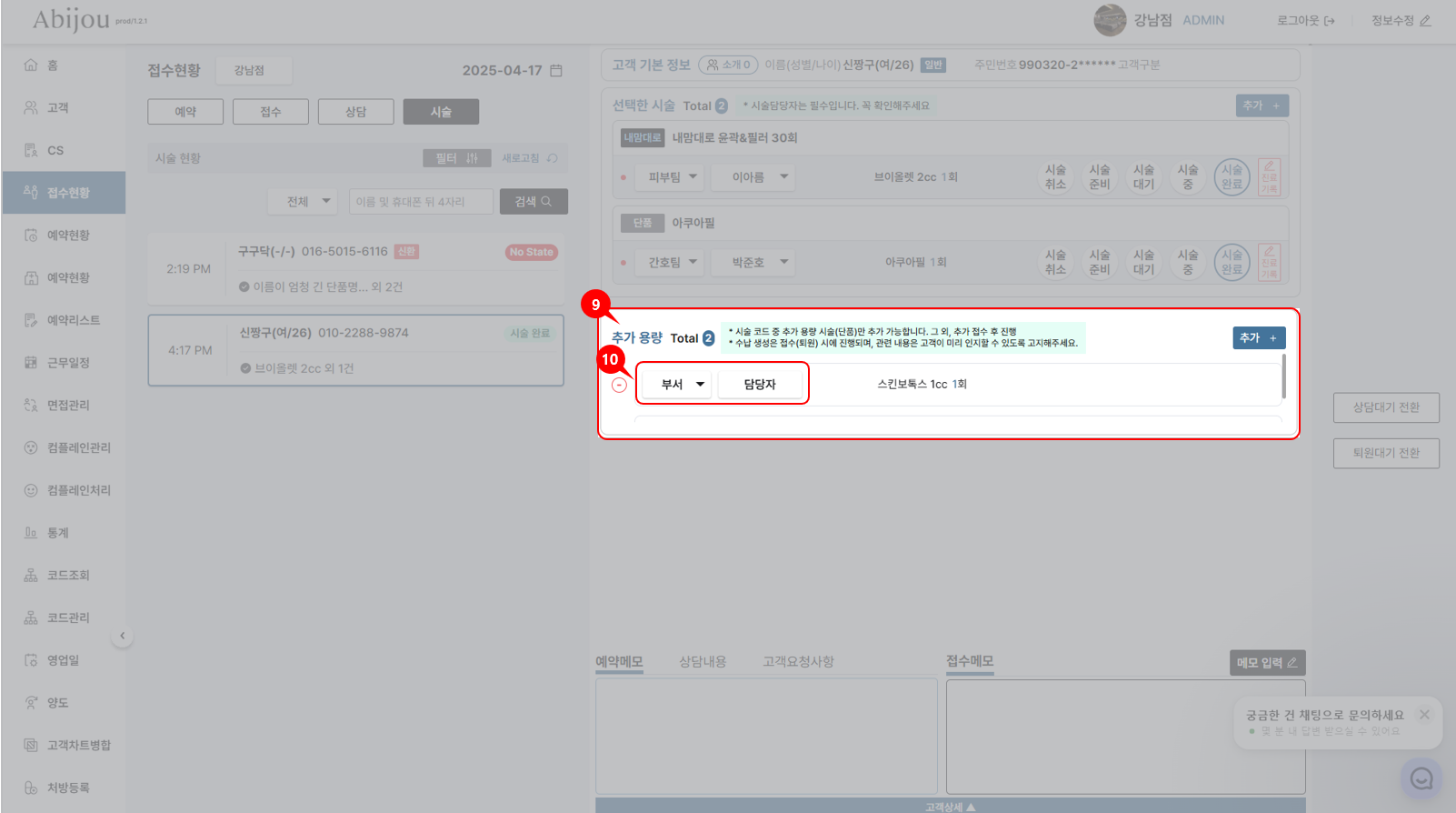 '시술탭'에서 담당자 선택이 누락됐다면, '접수/퇴원탭'에서 필수로 선택해주세요.